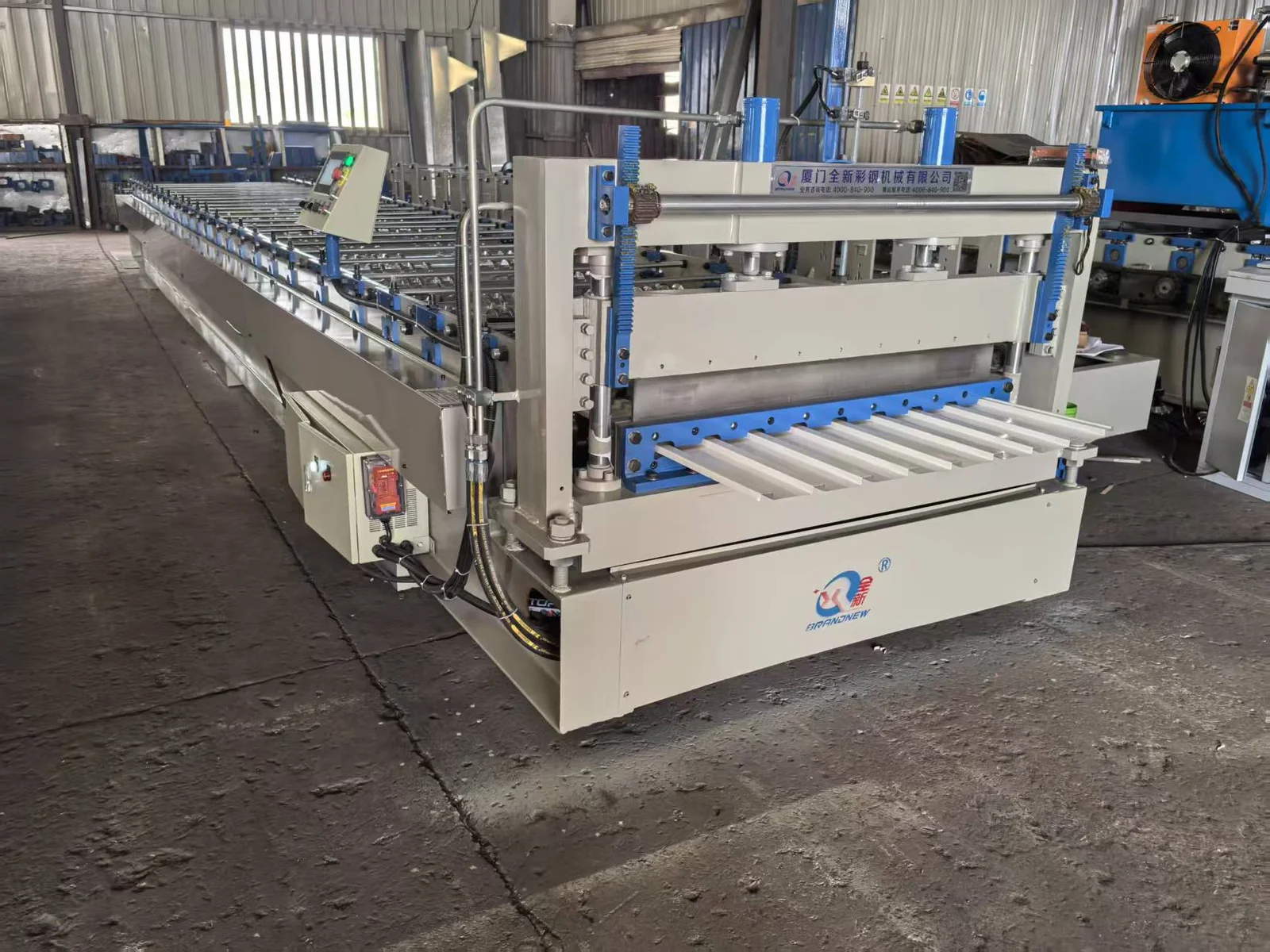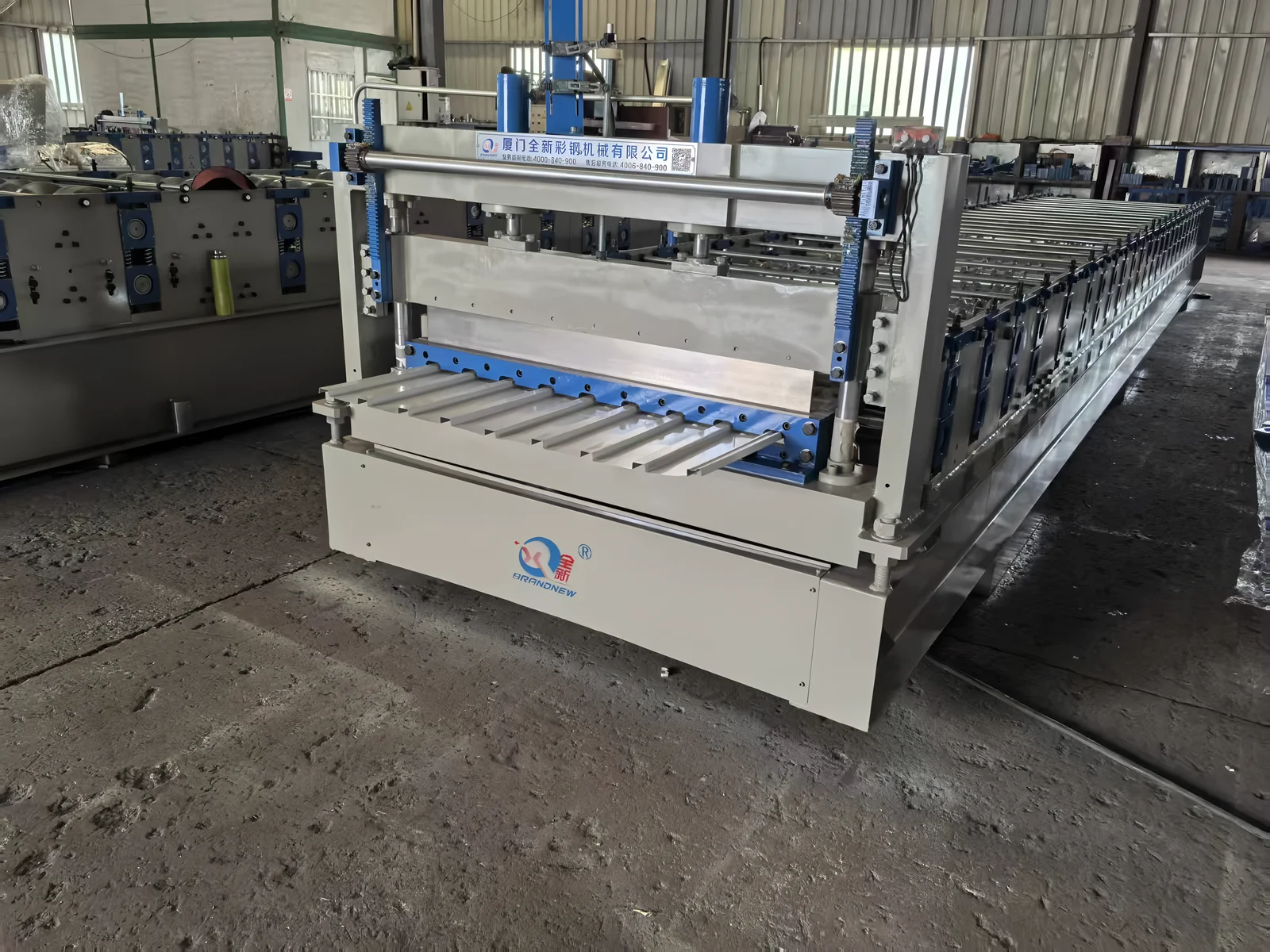 The whole machine set including a de-coiler, steel coil guiding device, front shearer, main roll forming machine, hydraulic post cutter and product racks.